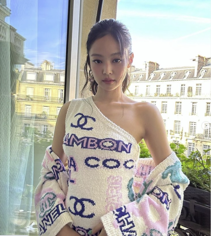 샤넬 패션쇼에 등장한 제니는 샤넬 로고가 빼곡히 수놓인 한쪽 어깨가 드러나는 미니원피스를 입고 가디건을 걸쳤으며, 화려한 악세사리와 네일까지 완벽한 패션을 선보였습니다.