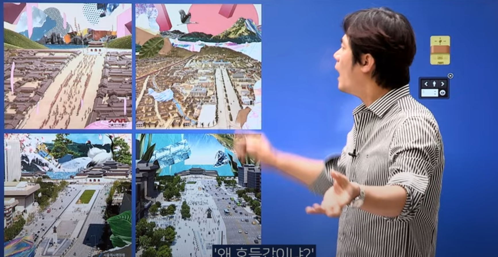 [ 조선시대 / 일제강점기 / 2009년 / 2022년 ]의 광화문 일대를 조망한 사진과 그림의 콜라보 형식으로