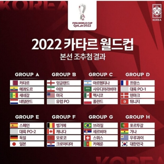 우리나라는 H조로 [ 대한민국, 포르투갈 , 우루과이, 가나 ]와 함께 묶였습니다.